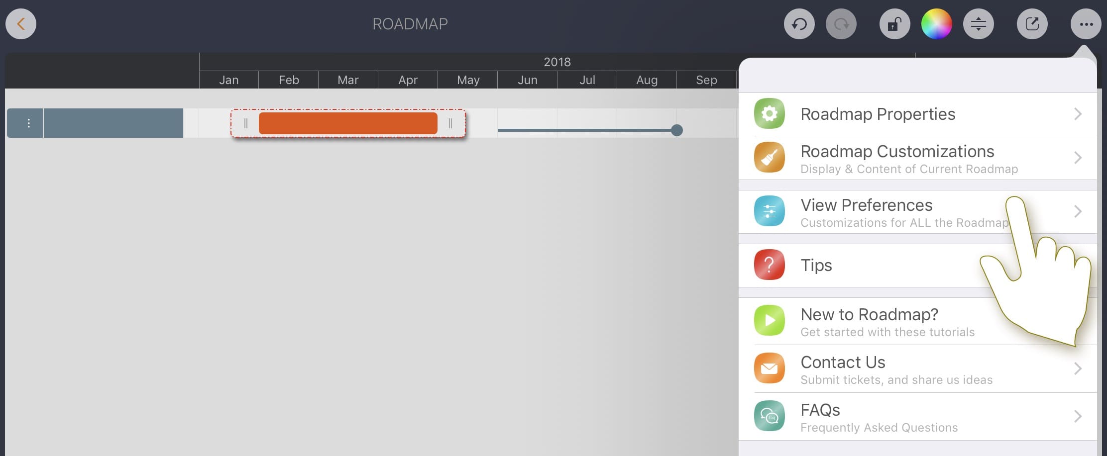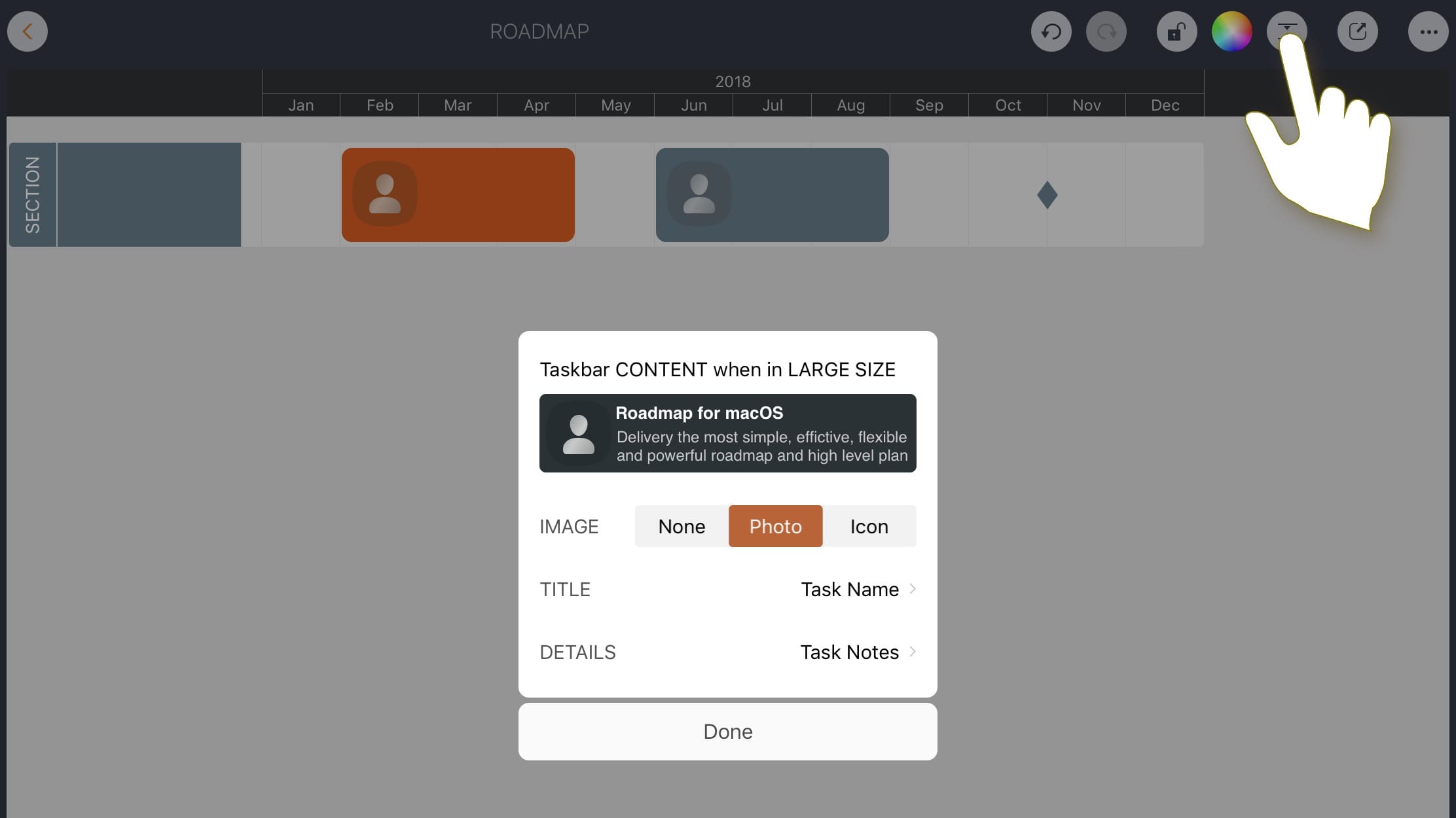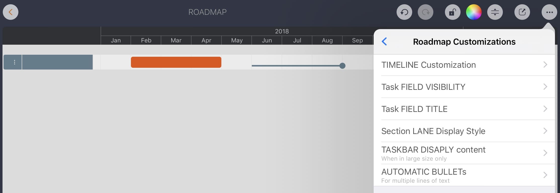 Roadmap app provides powerful configuration options to help customize the appearance of the document to make the user interface more business-friendly. Most options are associated with the document, affect only the opened document itself, and are stored within the document. These options also work the same way when opening the document on other devices.