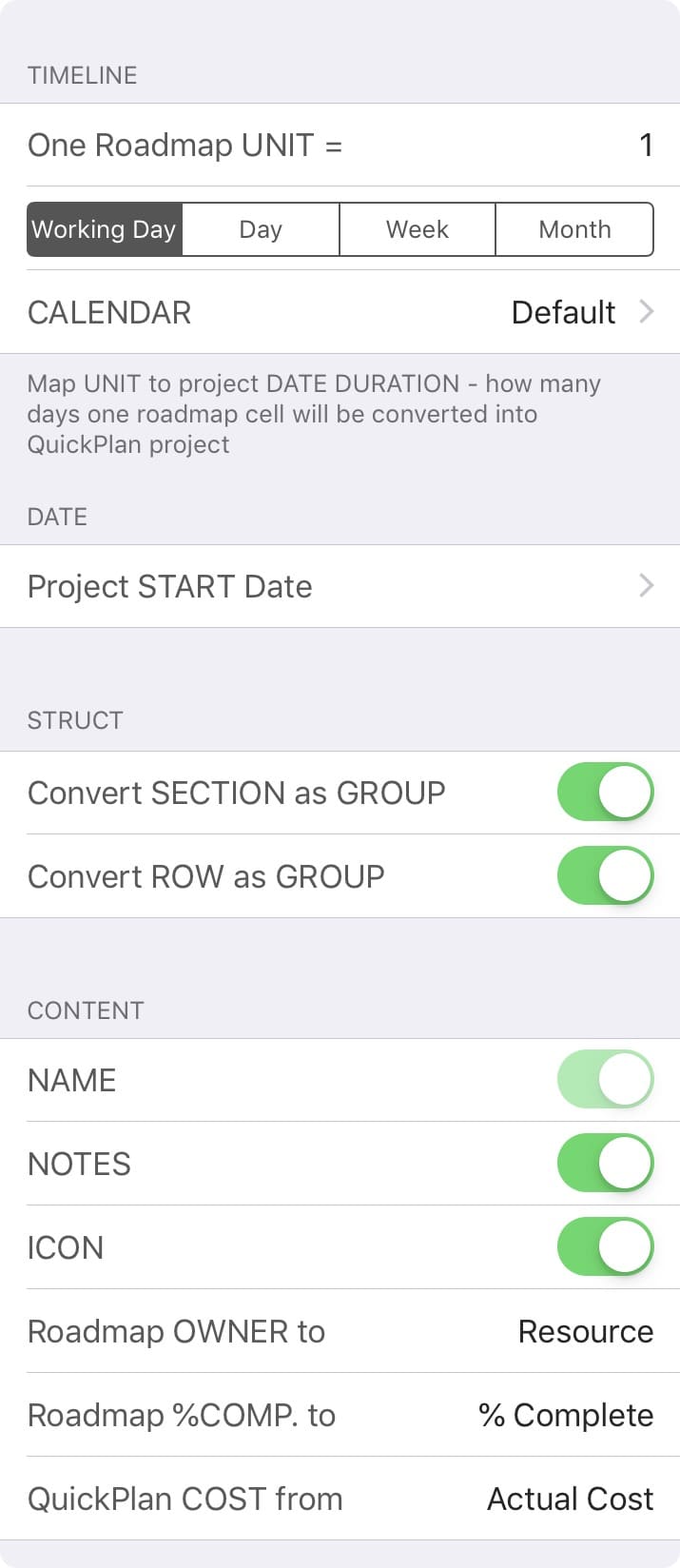 - Roadmap app does not support to import from QuickPlan file. (Roadmap app organizes tasks in sections and rows, and a task can't overlay another task. Converting QuickPlan schedule will cause logical problem)