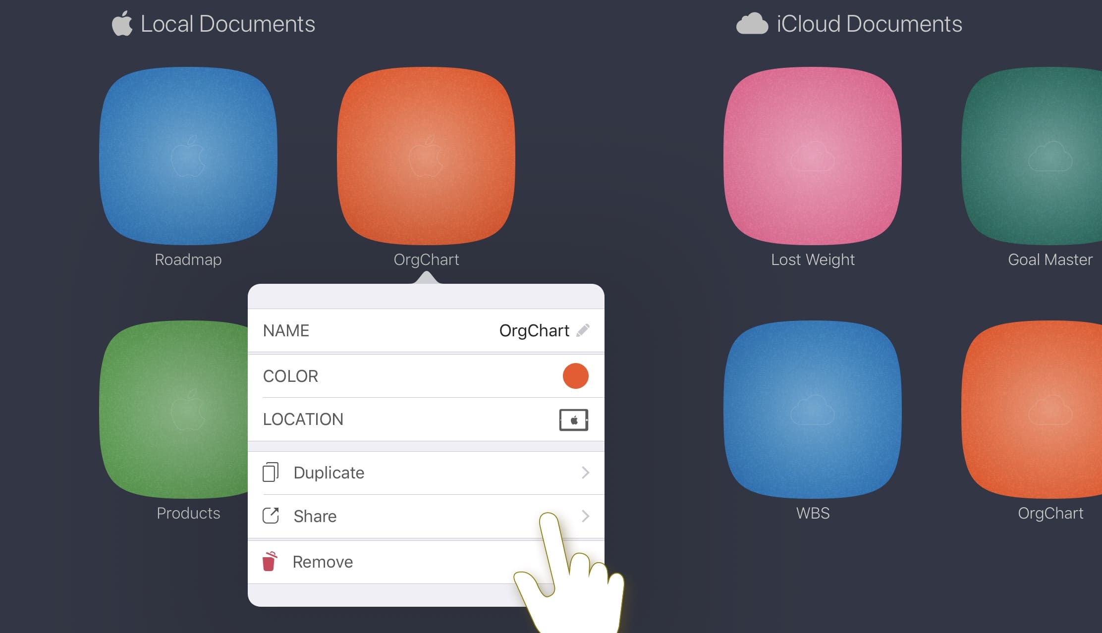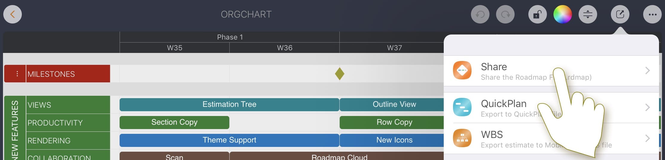 Or in an opened roadmap document, tap the "export" button on the toolbar, then to tap the "Share" menu.
