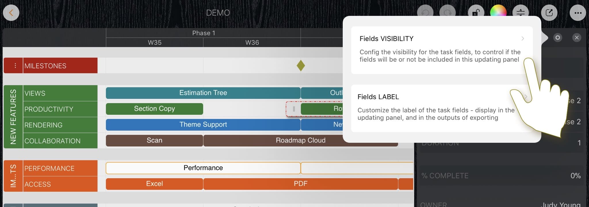 Roadmap supports to customize the title and visibility of the task fields