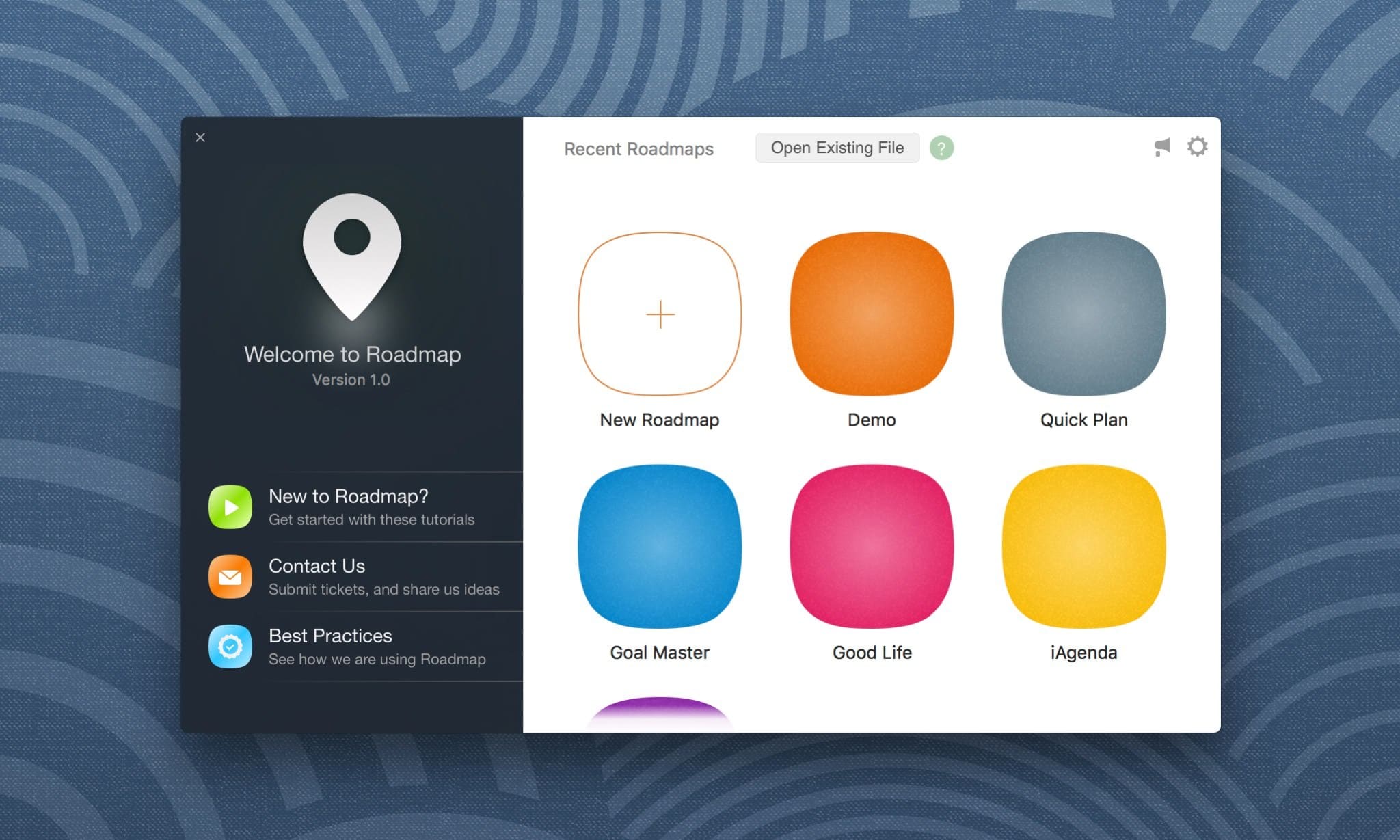Run the Roadmap app, and we will be guided to the welcome window. We can access the recently accessed roadmap files or load a roadmap by browsing a .rdmap file on the Mac device. Also, we can create a new roadmap file by clicking the "+" tile.