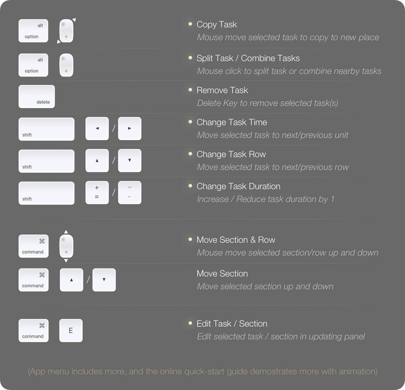 Please check out the following frequently used shortcut keys before getting started, and we can find more keyboard shortcuts from the app menu.