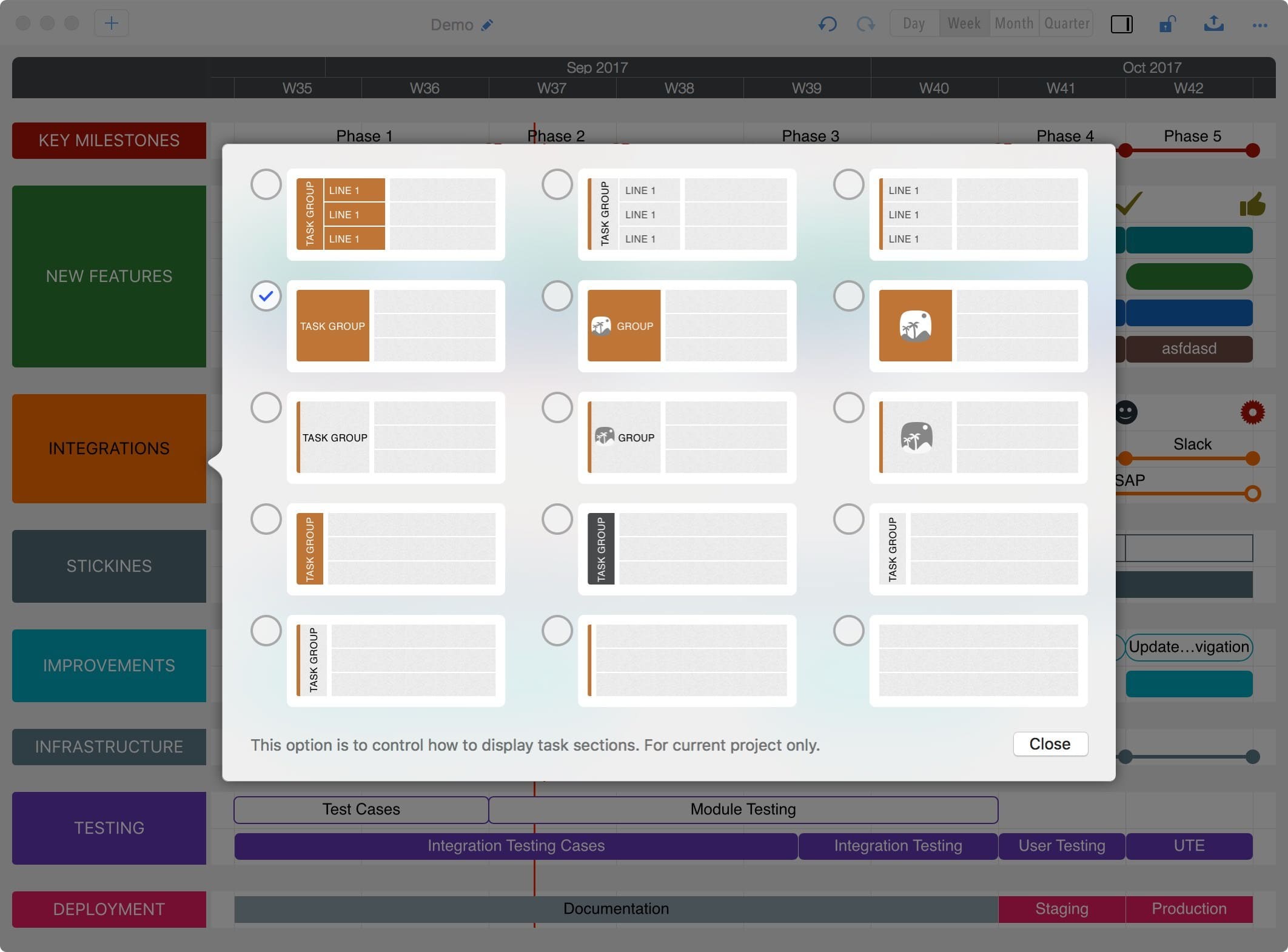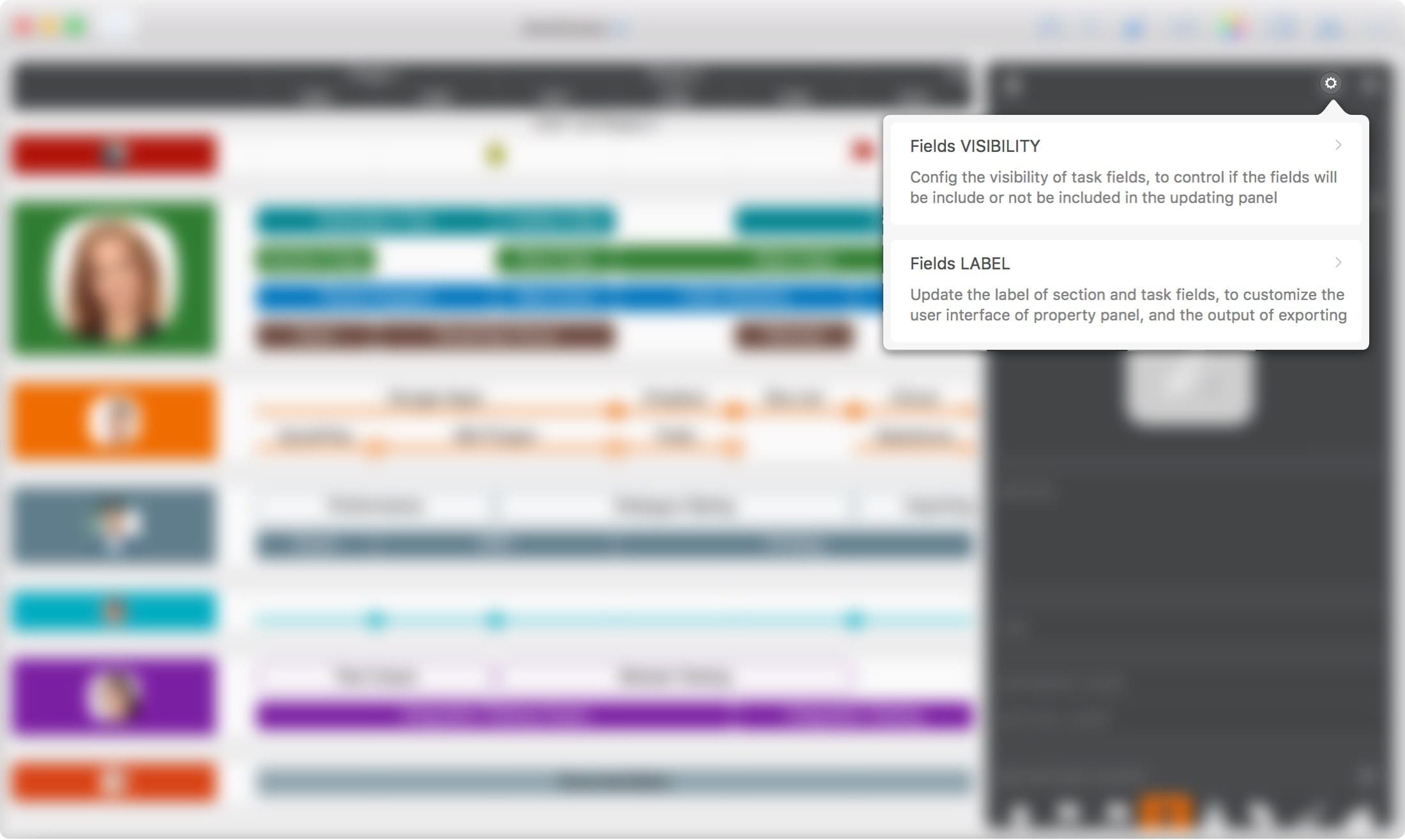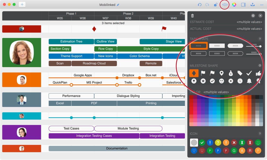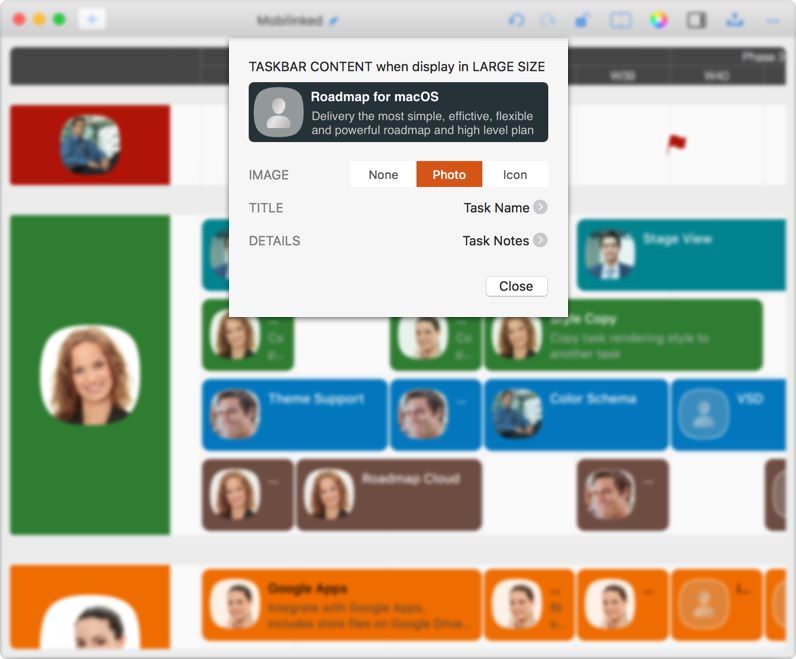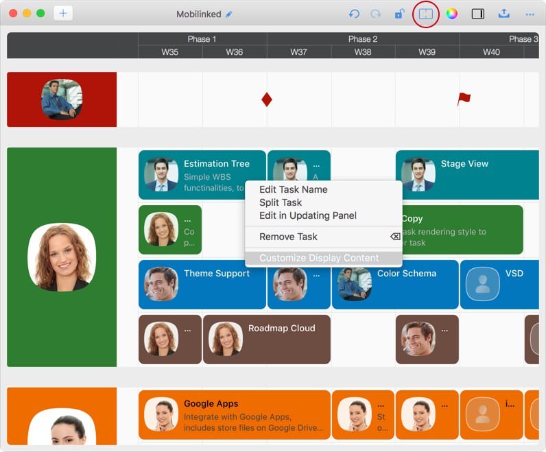Roadmap app provides powerful configuration options to help customize the appearance of the document to make the user interface more business-friendly. Most options are associated with the document, affect only the opened document itself, and are stored within the document. These options also work the same way when opening the document on other devices.