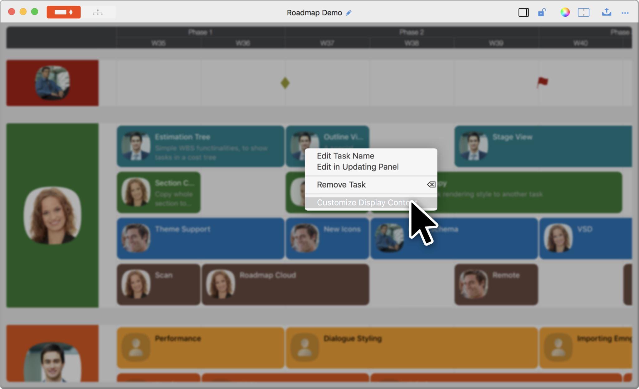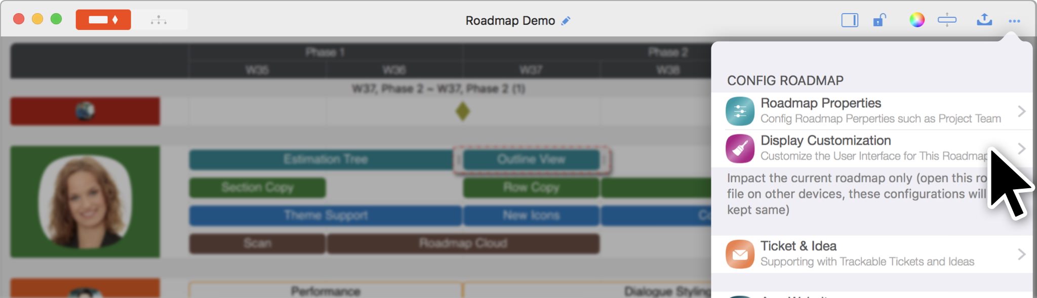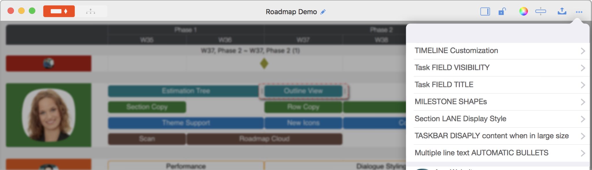 Roadmap app provides powerful configuration options to help customize the appearance of the document to make the user interface more business-friendly. Most options are associated with the document, affect only the opened document itself, and are stored in the document - these options also work the same way when the document is opened on other devices.