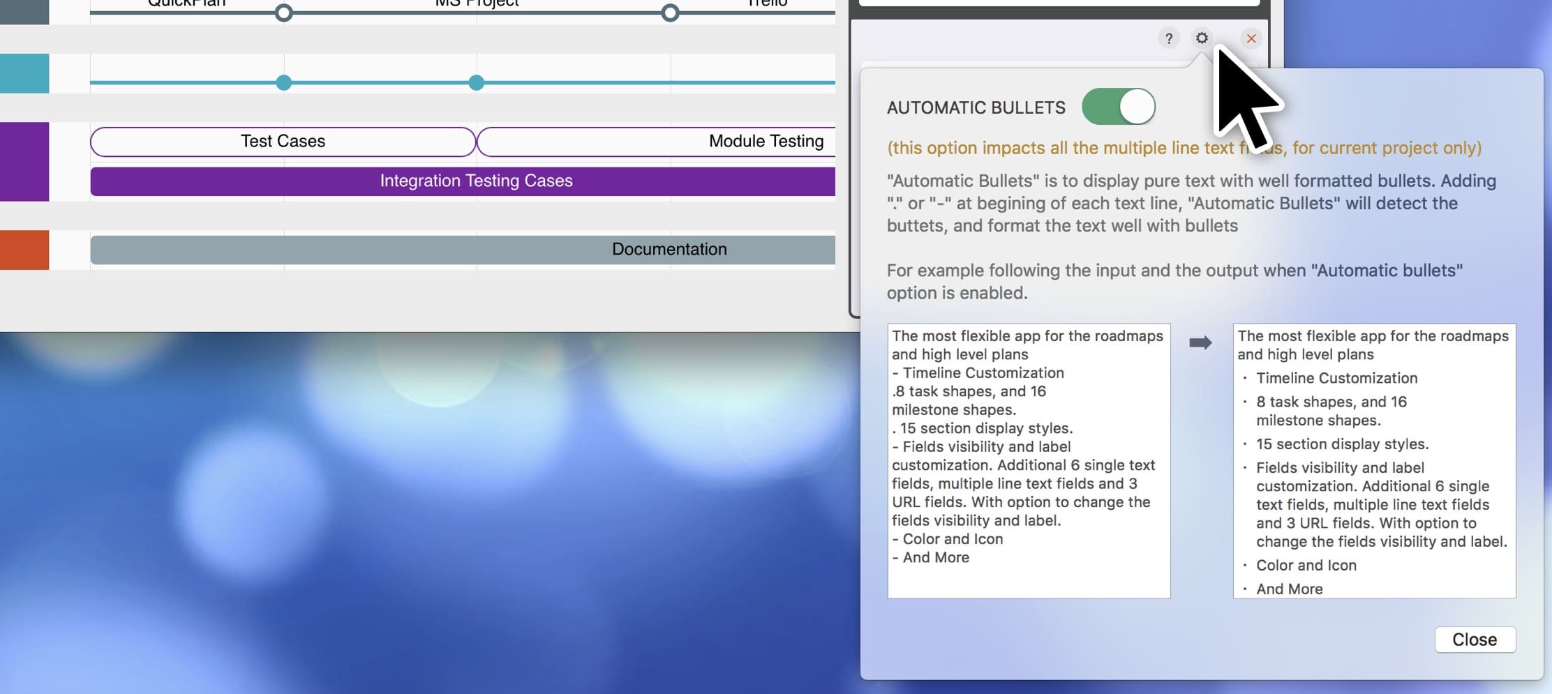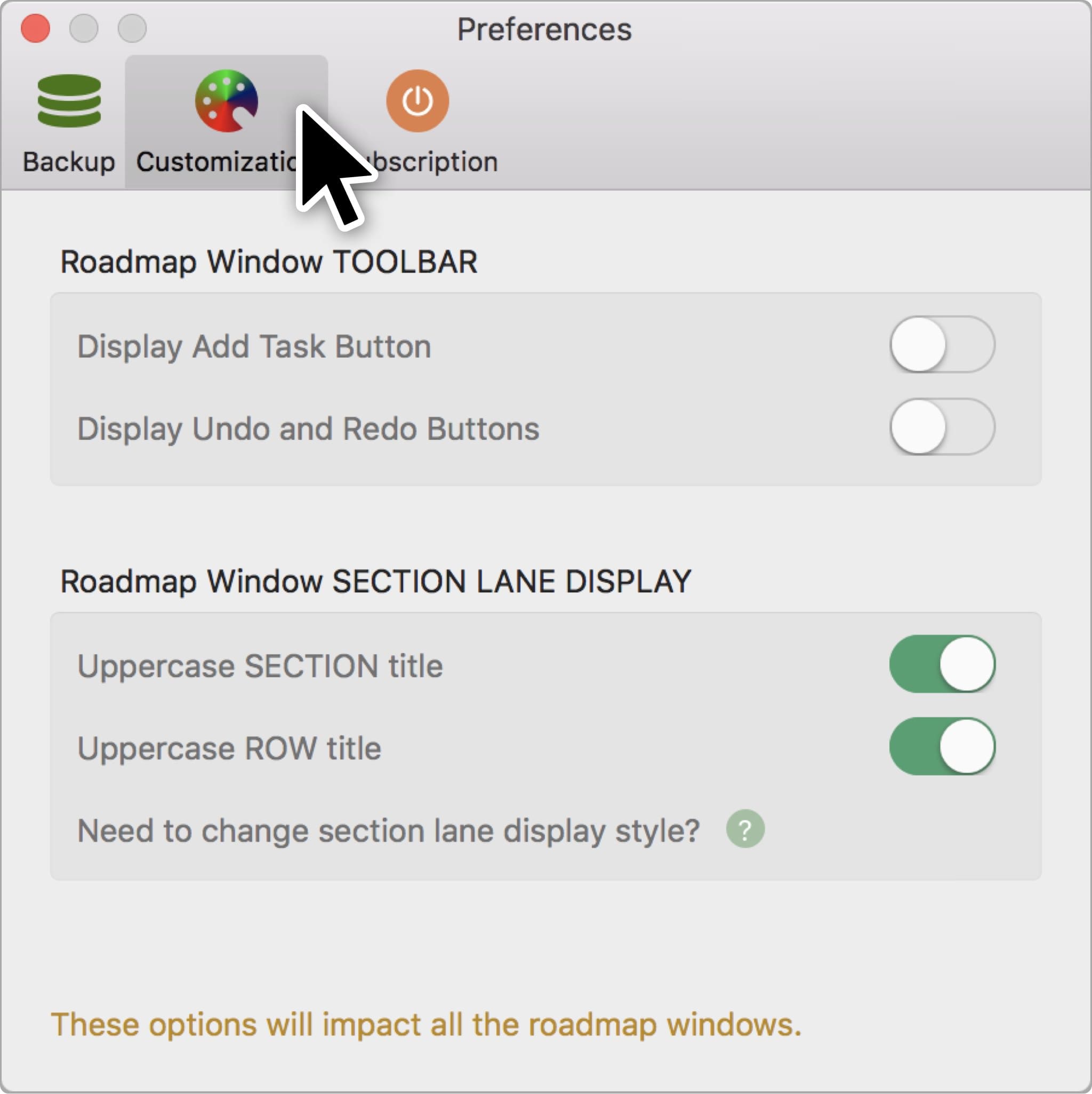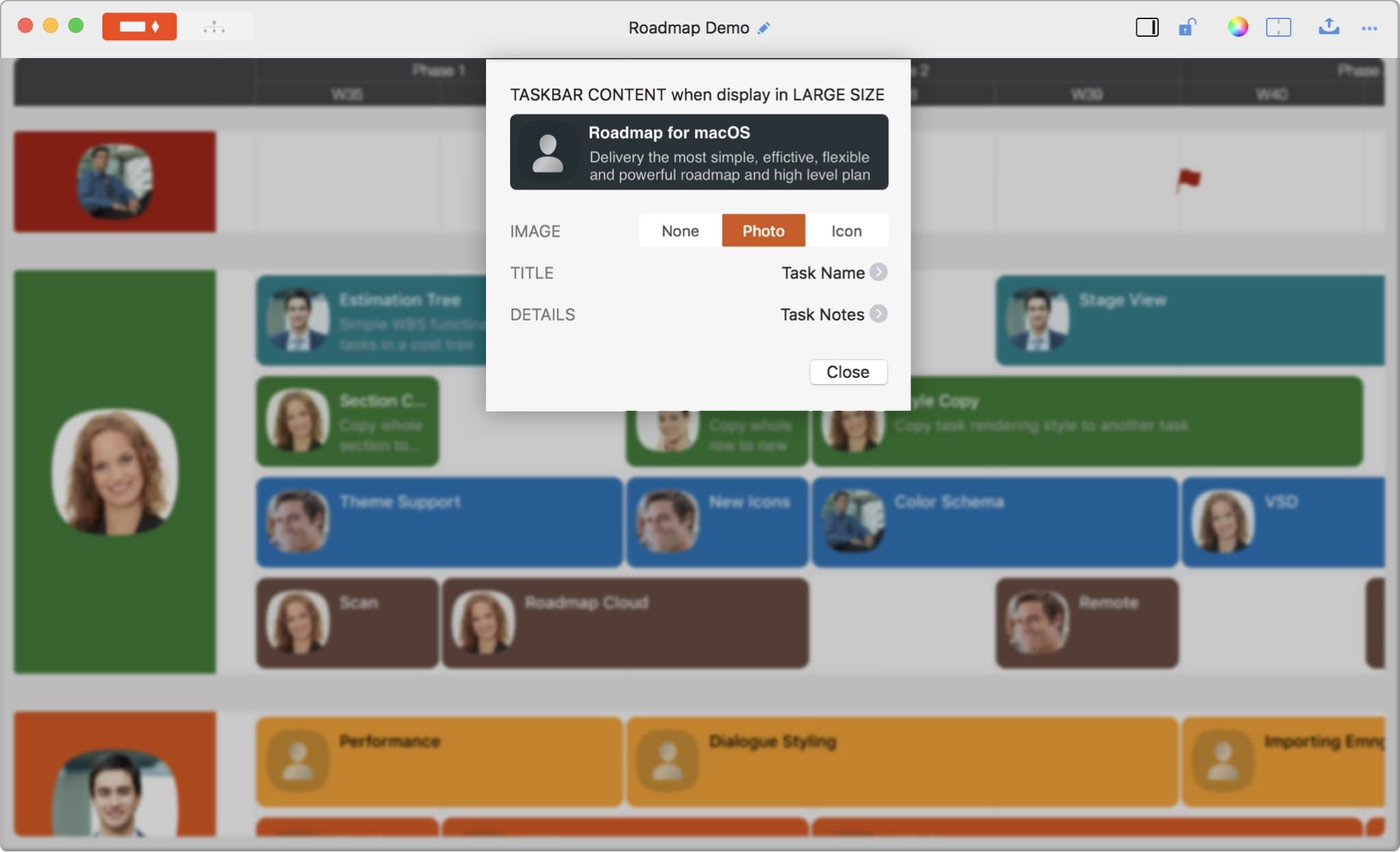 Roadmap app provides powerful configuration options to help customize the appearance of the document to make the user interface more business-friendly. Most options are associated with the document, affect only the opened document itself, and are stored in the document - these options also work the same way when the document is opened on other devices.