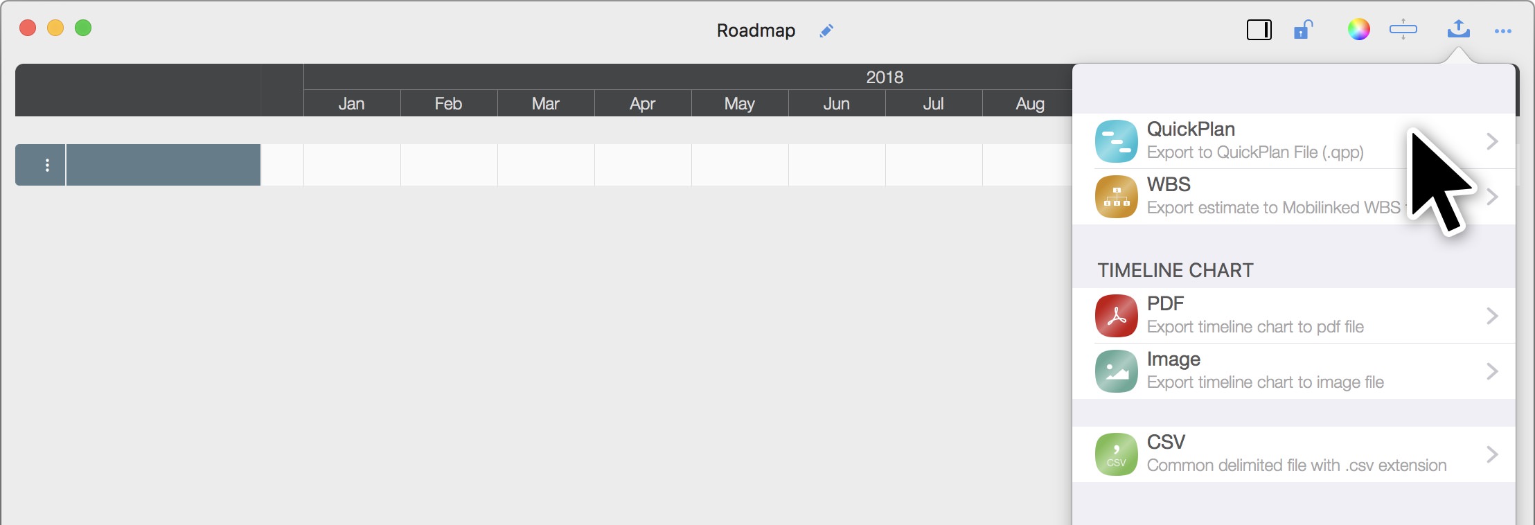 Roadmap supports exporting a roadmap document to a QuickPlan file, with options to customize timeline, dates, structure, and content.