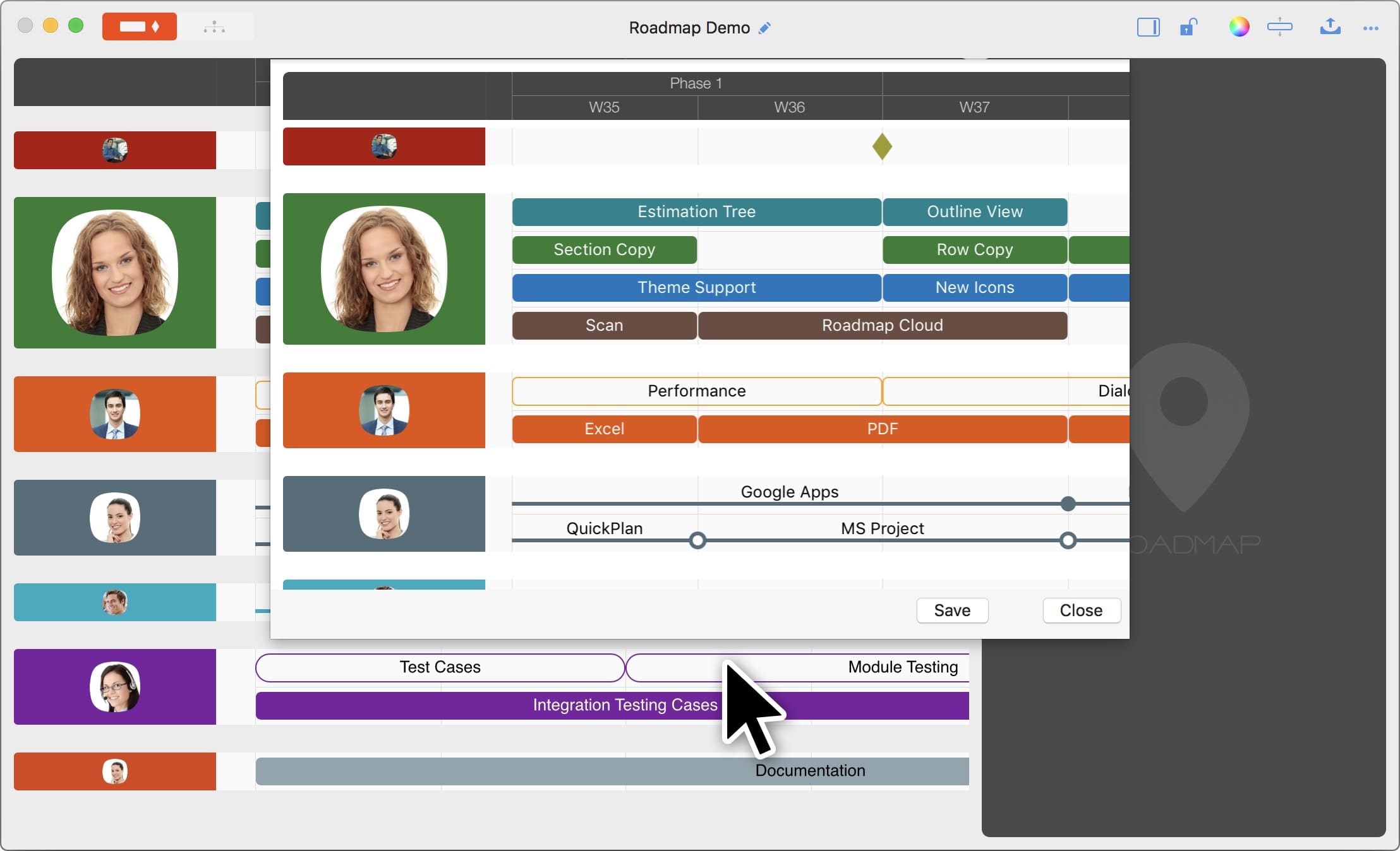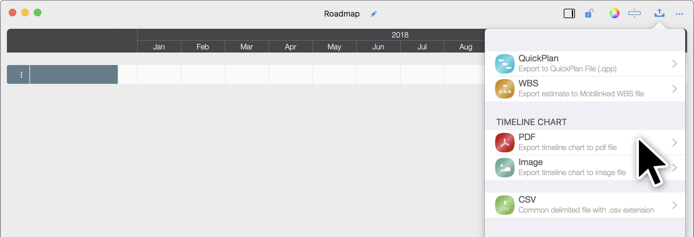 A roadmap document can be exported to PDF, CSV and Image files for reporting and communication.