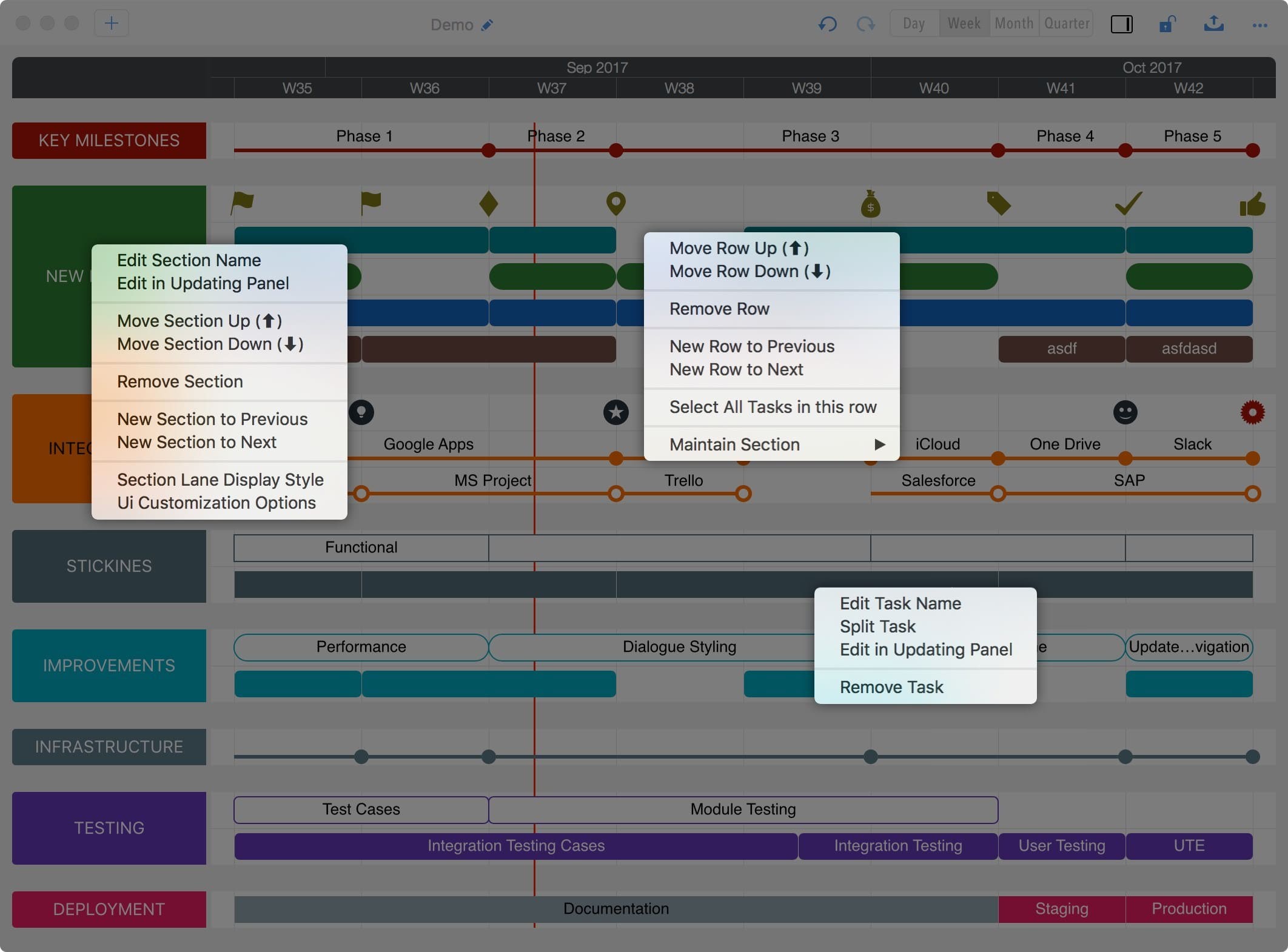 Right-click on a Section, a Row and a Task to display the related context menu.